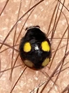 Diagnosis (macho): Cuerpo ovalado, convexo. Cabeza amarilla. Pronoto negro con 1/4 lateral y 1/4 apical amarillos. Escutelo negro. Élitros negros, con dos manchas amarillas, la primera discal, de 1/4 del largo del élitro, redonda, la segunda apical, ovalada y transversal. Lado inferior negro excepto hipómeros amarillos, excepto hipómeros amarillos, 1/8 lateral de l abdomen amarillo. Antenas y piezas bucales amarillas. Patas amarillo rojizo con 3/8 basales de fémures negros. Cabeza opaca, pronoto apenas brillante, élitros brillantes,