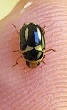 Diagnosis (macho): Forma ovalada de lados casi paralelos, convexa. Cabeza amarilla. Pronoto amarillo con una mancha trapezoidal de la base a los 2/3 del largo, deja bordes amarillos angostos. Escutelo negro. Élitros negros con bordes basal y lateral amarillos, el basal proyectado en triángulo cerca del escutelo, mancha longitudinal amarilla en el disco, angosta y alargada desde los 2/5 del largo hasta casi el ápice, donde entra en contacto con la banda lateral. Superficie ventral amarilla con cabeza, pro-, meso- y metasterno negros, abdomen marrón oscuro excepto ventritos 5-6 amarillo rojizos. Patas, antenas y piezas bucales amarillas.