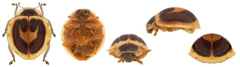 Diagnosis: Cuerpo oval, redondeado. Cabeza amarillo pálido. Pronoto del mismo color con una gran mancha marrón oscuro semicircular, que ocupa el tercio basal hasta los 3/4 del largo. Élitros amarillo palido con dos grandes manchas marrones, unidas ligeramente en sus bases, separadas de la base y el borde lateral, la primera ovalada, sub sutural, ocupa hasta los 2/5 del largo, la segunda en forma de "c", desde el escutelo hasta casi tocar la sutura entre los 3/5 y 5/6 del largo del élitro, más angosta en la base. Lado inferior marron claro sucio, oatasa antenas y piezas bucales amarillentas.