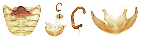 Vistas dorsal, ventral, frontal, lateral y posterior. Imágenes adaptadas de Basilio et al 2026. Abdomen macho, tegmen y guía del penis ventral, tegmen lateral, penis Abdomen hembra, aparato genital, espermateca, terminalia.