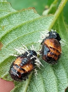 solo dos manchas amarillentas transversales sobre los élitros. El color elitral puede ser negro o azulado, con manchas varian del crema al anaranjado.