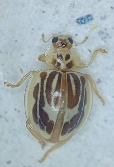 Psyllobora delicata Diagnosis: Forma ovalada y algo convexa. Cabeza y pronoto amarillo pálido, el último con 4 manchas marrones, dos basales triangulares, y dos discales redondeadas, más oscuras y más cercanas entre sí. Escutelo marrón. Élitros amarillo pálido, con 11 manchas marrones (3:4:2:2), separadas de los bordes y de la sutura. La 1 y 4, 2 y 5, y 3, 6 y 8 y 7-9 unidas formando líneas longitudinales paralelas algo irregulares, en especial las dos líneas más cercanas a la sutura unidas por la base formando un ovalo alargado abierto por delante. Manchas 10 y 11 ovales, cercanas al ápice. Un gran espacio irregular sin manchas, común a ambos élitros desde la mitad a los 3/4 del largo, ocupando la 1/2 del ancho. Patas, antenas y piezas bucales marrón amarillento. |