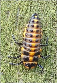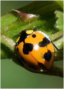| Variación: los machos tienen la cabeza total o parcialmente amarilla y pueden poseer parte del lado inferior y de las patas amarillas (Mulsant, 1850). Mancha negra común en el ápice de forma variables, acorazonada a redondeada. Algunas manchas pueden estar parcialmente fundidas.