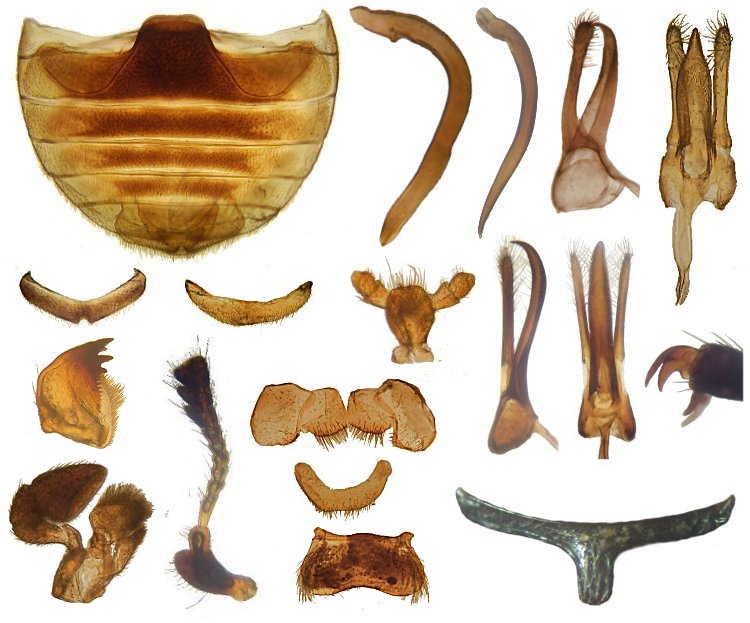 Morfología del género Adalia: Abdomen, penis (2 especies), tegmen (lateral e interior) - 6º ventrito (macho, hembra), labio, tegmen (otra especie, lateral e interior ápice, uñas tarsales - mandíbula, antena, labio, placa genital y 10º tergitp hembra, labro, prosterno.