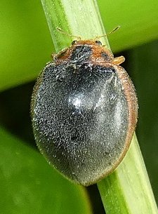 Diagnosis: Forma oval, alargada, de lados elitrales redondeados y muy explanados, ancho máximo a 2/5 del largo del élitro. Cabeza y pronoto marrón amarillentos, el último con el 1/4 central negro y dos manchas en los tercios laterales aisladas del mismo color. Escutelo negro. Élitros negros con un amplio margen lateral y un delgado margen basal marrón rojizos. Puntuación elitral no dual. Pilosidad blanco grisacea. Lado inferior marrón amarillento, excepto metasterno y parte media del abdomen marrón negrusco. Piezas bucales amarillas a marrón oscuro, antenas amarillas con segmentos basales negros y apicales marrón grisaceo. Patas negras.