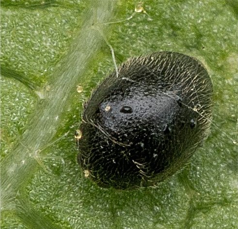En la naturaleza: Una larva de Stethorus tridens, sobre una hoja.